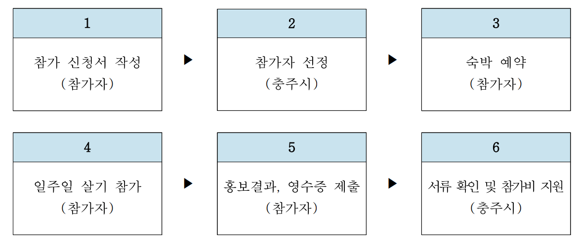 ▶ 체류기간 발생하는 모든 사고에 대하여는 참가자가 책임을 지며 충주시는 귀책 사유가 없음
