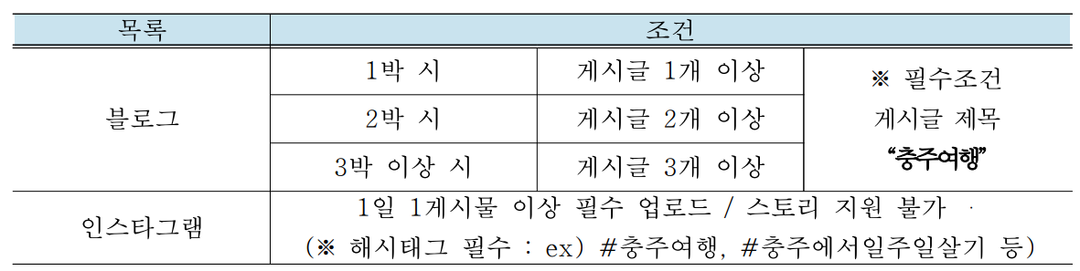 ▶ 충주시 소재 숙박업소에서 체류 필수(※ 노지캠핑 등 무료 숙박시 숙박비 지원 제외)