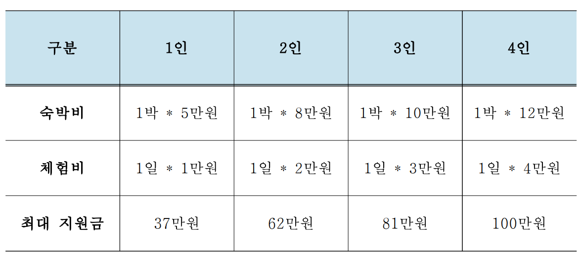 ▶ 1인 1일 기준 숙박비 5만원, 체험비 1만원 내 실비지원