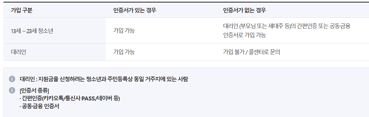 - 거주지 인증을 위해 간편인증서 또는 공동·금융 인증서 필수(청소년 본인 또는 대리인의 간편인증 또는 공동 ·금융 인증서 필요)