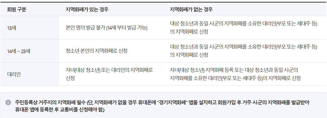 ※ 13세 또는 휴대폰이 없거나 지역화폐 App을 설치할 수 없는 휴대폰을 이용하는 청소년의 경우에는 대리인 (해당 지역의 지역화폐를 소유한 자) 지역화폐로 신청가능