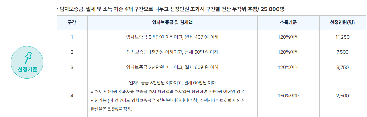 ▶ 임차보증금, 월세 및 소득 기준 4개 구간으로 나누고 선정인원 초과 시 구간별 전산 무작위 추첨 / 25,000명