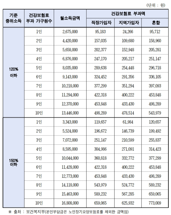 2024년 기준 중위소득별 건강보험료 소득판정 기준표