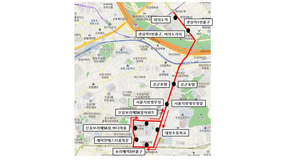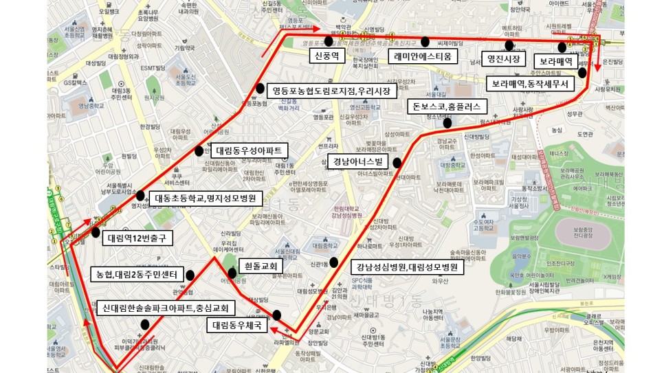 대림역–대림동우성아파트–신풍역–보라매역–돈보스코–강남성심병원–대림어린이공원-대림역