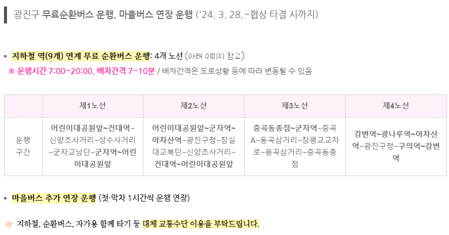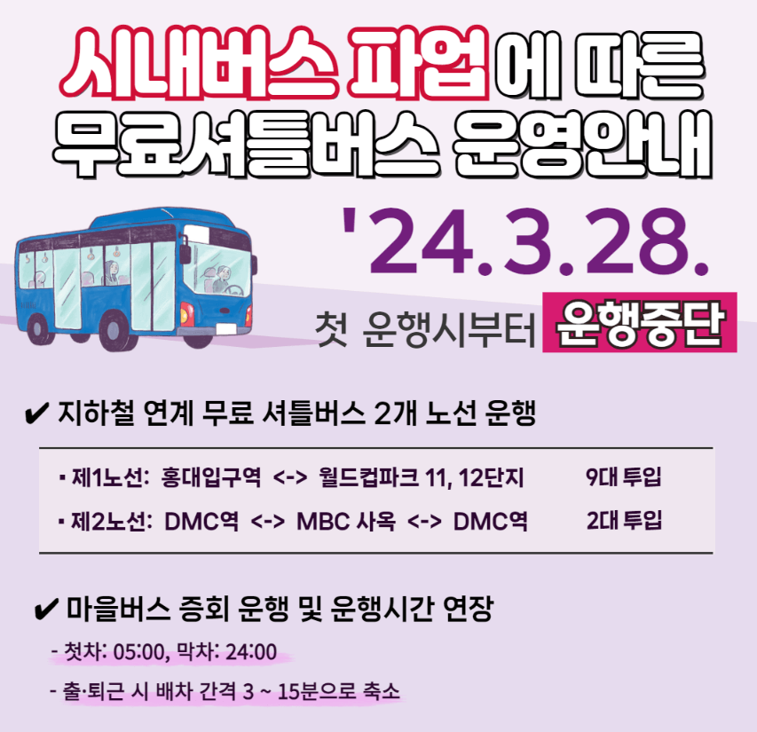 2024.03.28 - [정보 모아보기] - 서울 시내버스파업, 무료셔틀버스 [중랑구, 송파구, 은평구]