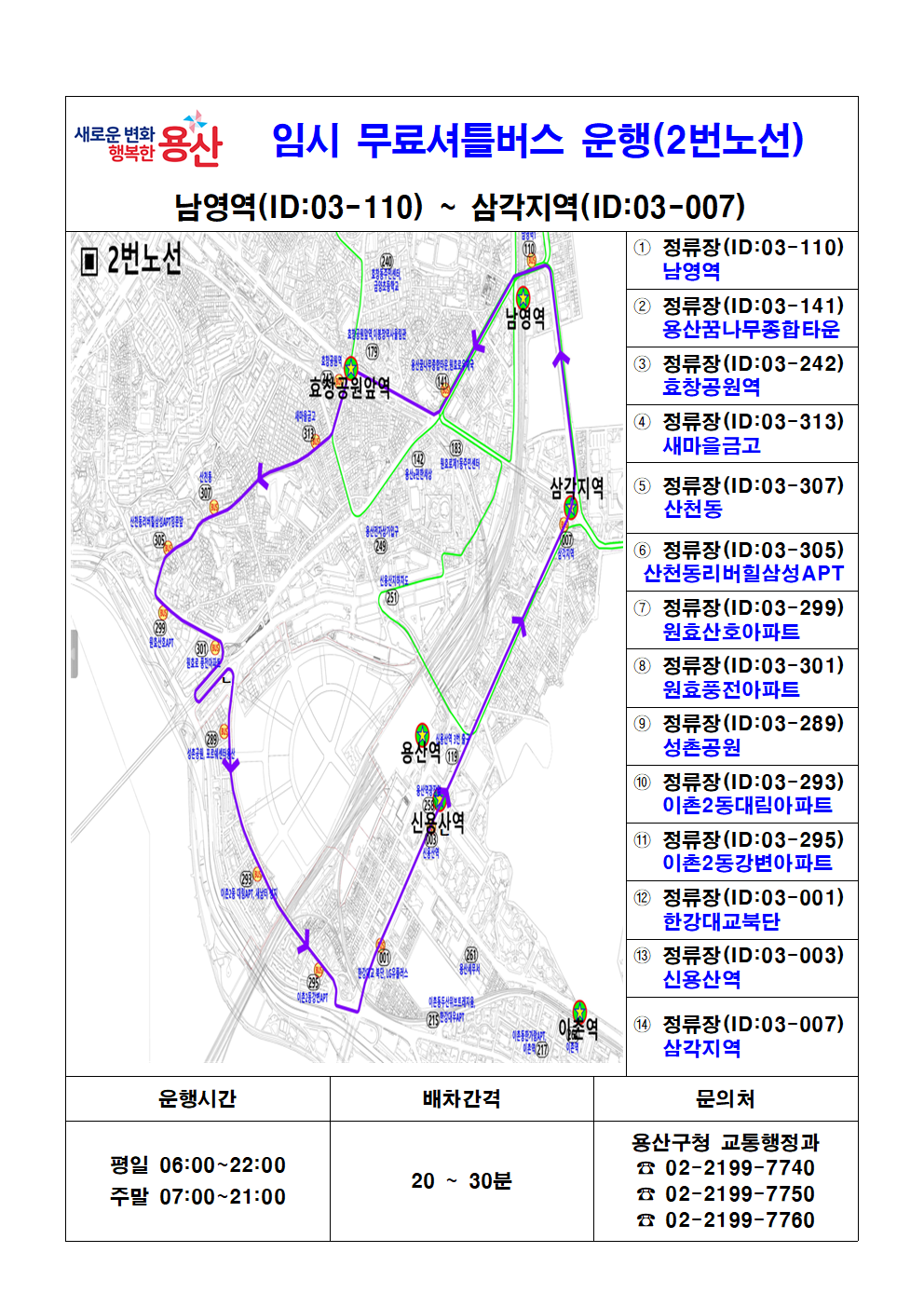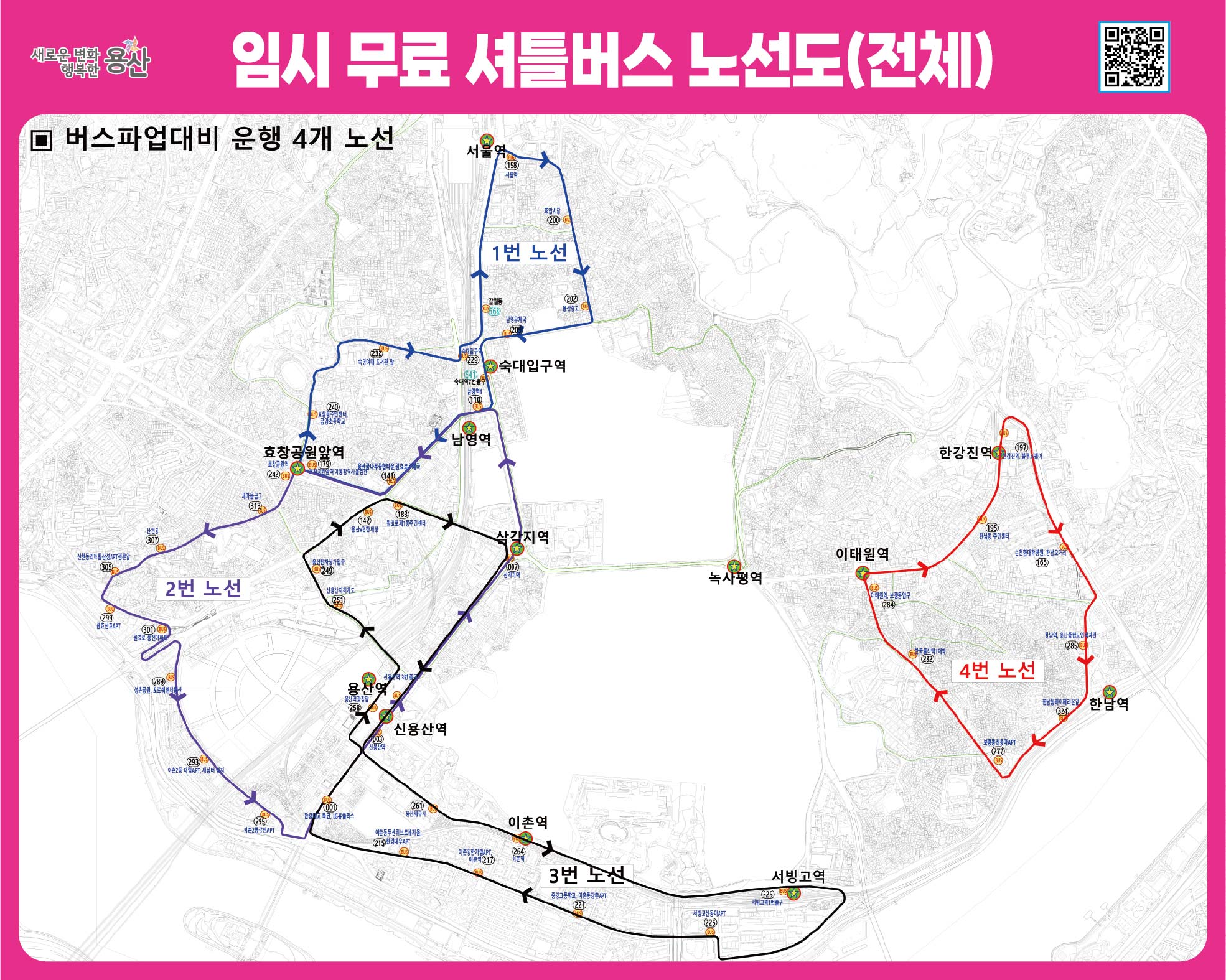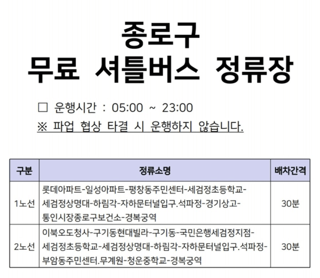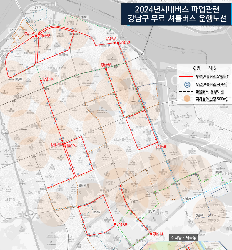 서울 시내버스 파업으로 인한 무료셔틀버스 구별 노선도 안내