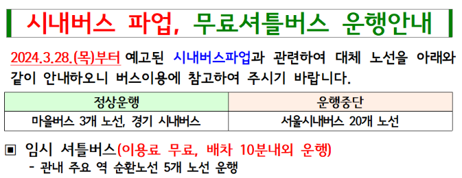 2024.03.28 - [정보 모아보기] - 서울 시내버스 파업, 무료셔틀버스 운행정보, 지하철 운행 증회 정보