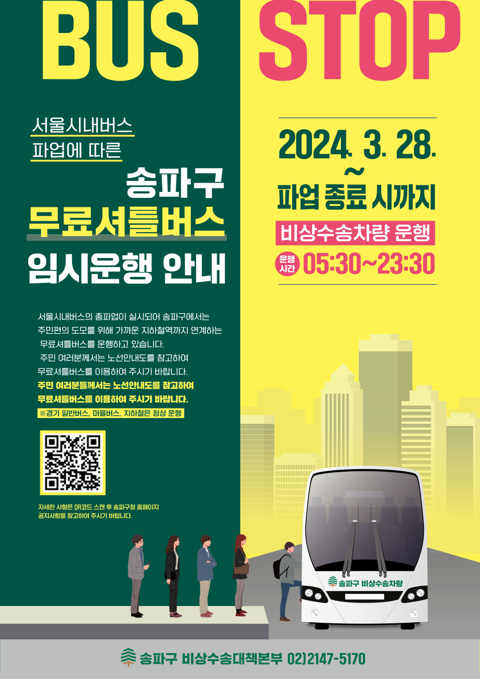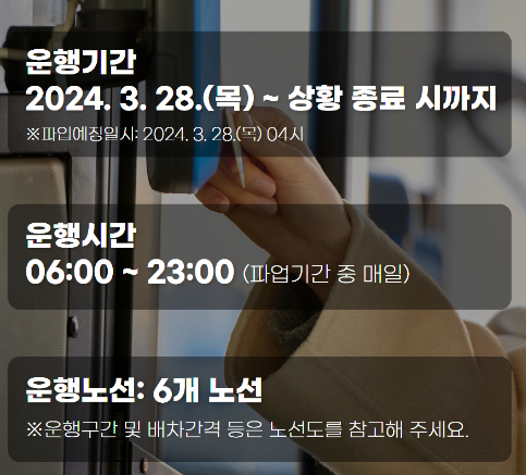 2024.03.28 - [정보 모아보기] - 서울 시내버스 파업, 무료셔틀버스 운행정보, 지하철 운행 증회 정보