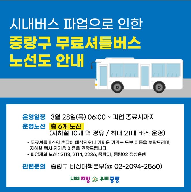 2024.03.28 - [정보 모아보기] - 서울 시내버스파업, 무료셔틀버스 [마포구, 금천구, 광진구, 영등포구]