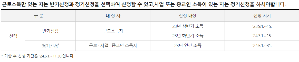 ▶ 근로소득자는 반기신청 24.3.1~3.15 , 정기신청 가능 24.5.1~5.31