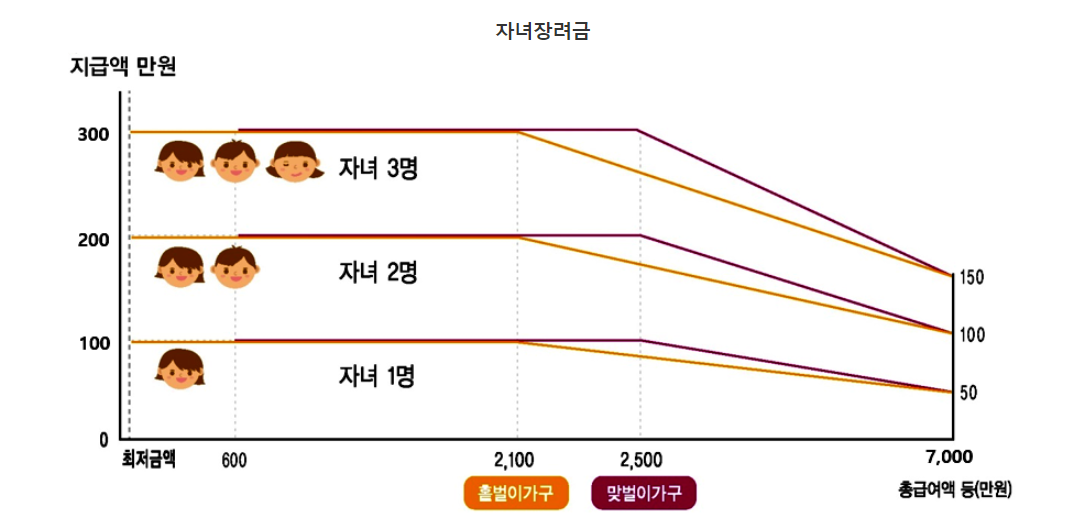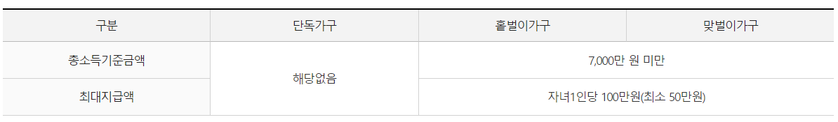 ▶ 저소득 가구의 자녀양육을 지원하기 위해 총소득(부부합산) 7,000만원 미만이면서 부양자녀(18세 미만)가 있는 경우 1인당 최대 100만원(최소50만 원)을 지급하는 제도입니다.