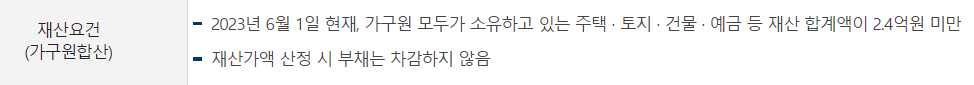 ▶ 가구원 모두가 소유하고 있는 주택, 토지, 건물, 예금, 자동차 등 재산의 합계액이 2억 4천만 원 미만이나 부채는 차감하지 않습니다. 토지 개별공시지가, 아파트 및 빌라 공동주택공시가격, 단독주택 개별단독주택공시가격 기준입니다.