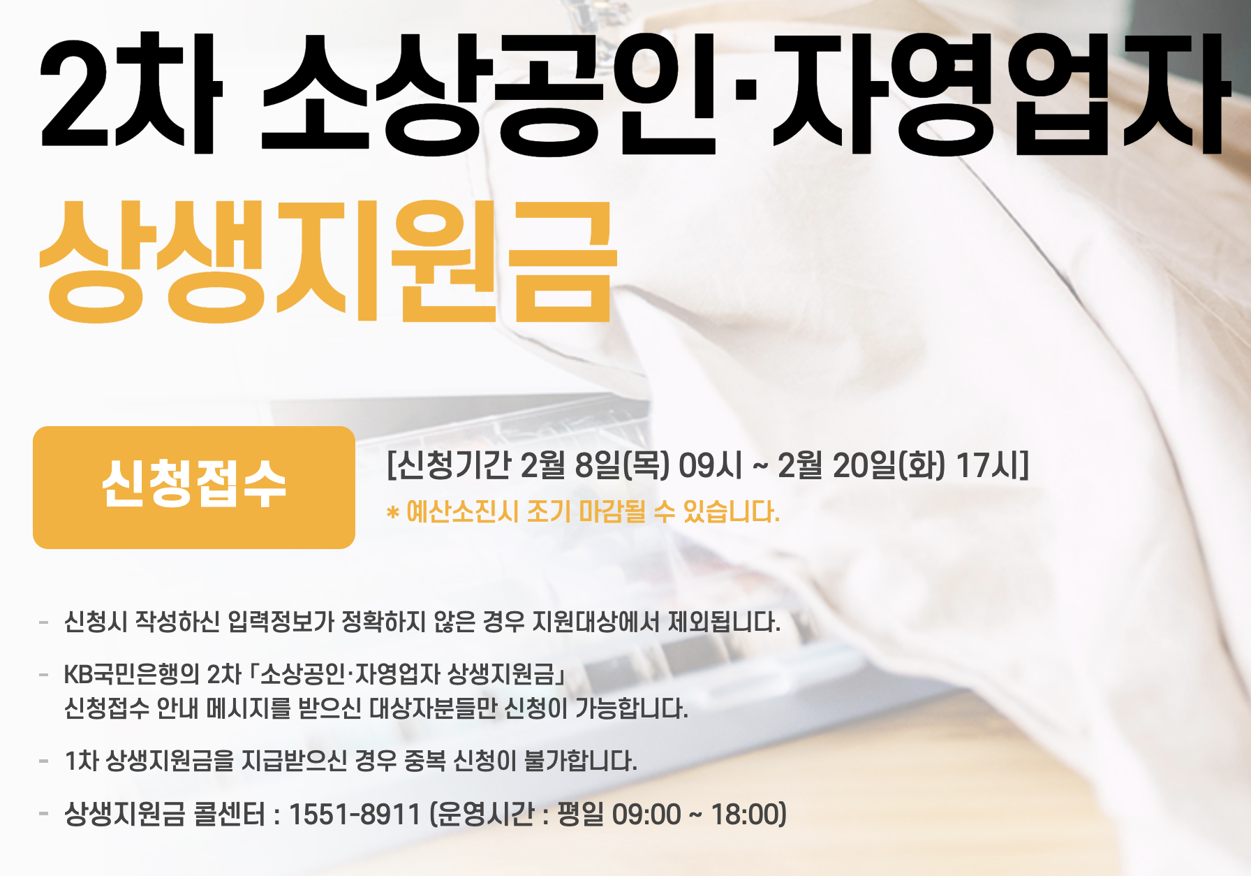 상생지원금 지원대상자는 KB국민은행의 2차 「소상공인·자영업자 상생지원금」 신청접수 사전안내[카카오톡 또는 LMS]를 받으신 분들로 한정되며, 현재 사업을 영위중인 개인사업자분들이 대상입니다. 휴폐업 상태이시거나 법인사업자의 경우에는 지원대상에서 제외가 됩니다.