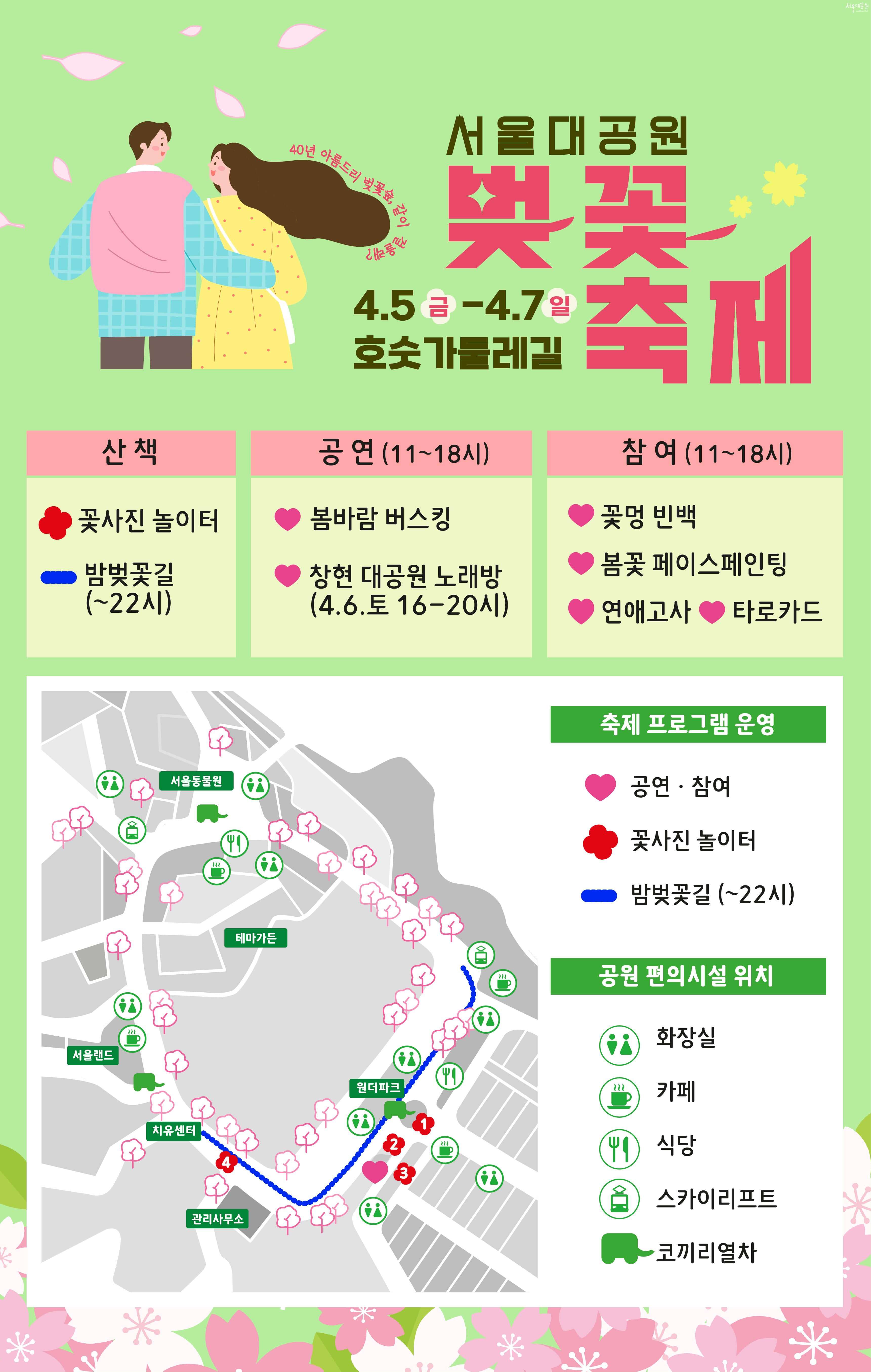 ▶ 4월 5일부터 서울대공원에서는 [40년 아름드리 벚꽃 수, 같이 걸을래?] 벚꽃축제가 열립니다.