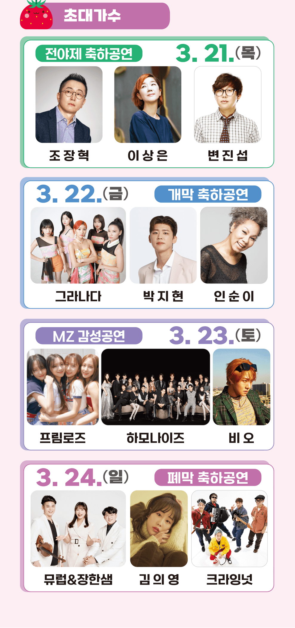 ▶ 3월 21일 전야제부터 22일, 23일, 24일 폐막식까지 4일 내내 초대 가수의 공연이 준비되어 있습니다.