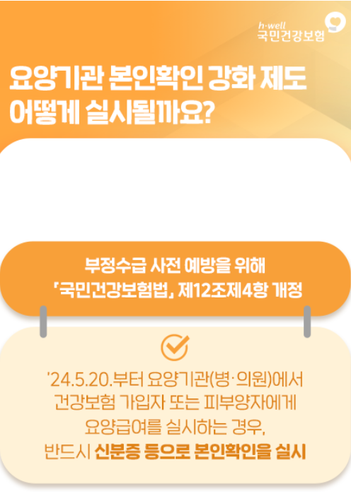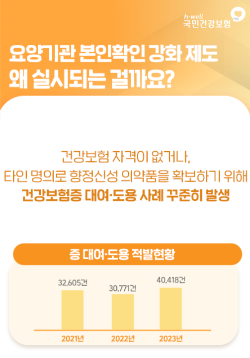건강보험 자격이 없는 경우의 부정수급과 다른 사람의 명의로 향정신성 의약품을 받는 부정수급을 막기 위해 국민건강보험법이 개정되면서 진료 시 본인확인 절차를 강화하기 위함이라고 합니다.