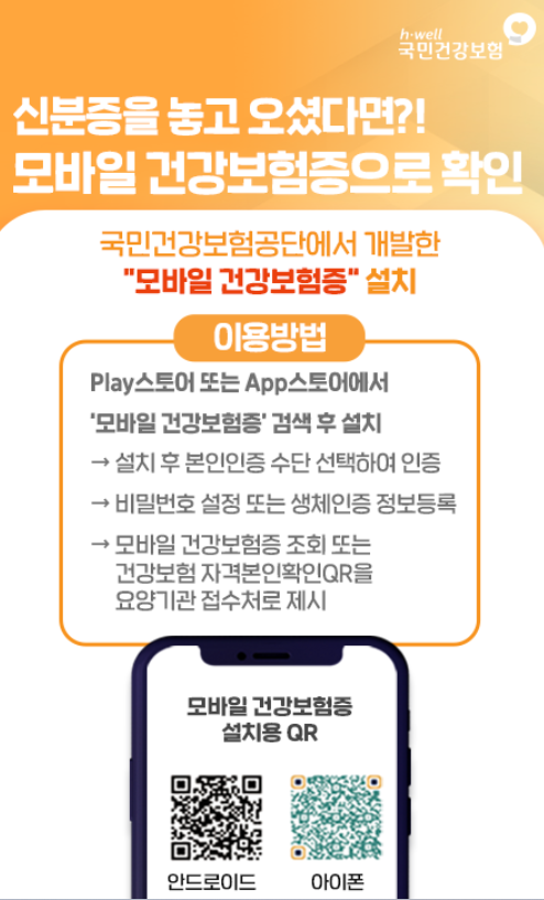 ▶ 신분증을 깜빡 잊고 병원에 방문했다면 휴대폰에서 '모바일 건강보험증' 앱을 다운로드하여 본인인증 후 QR을 접수처에 제시하시면 됩니다.
